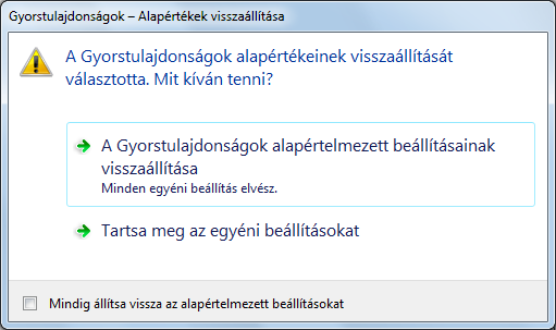 A Gyorstulajdonságok alapértelmezett beállításainak visszaállítása