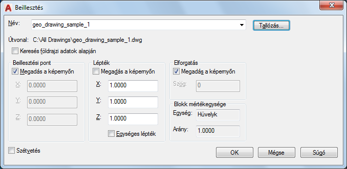 Megadja a beilleszteni kívánt blokk vagy rajz nevét és helyét.
