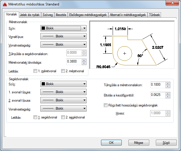 A méretstílusok segítségével vázlatolási szabványokat adhat meg és alkalmazhat. A MÉRETSTÍLUS paranccsal számos méretezési rendszerváltozót megadhat, így lényegében a méret megjelenésének és viselkedésének minden elemét vezérelheti. Minden méretstílusban mentve lesznek ezek a beállítások.