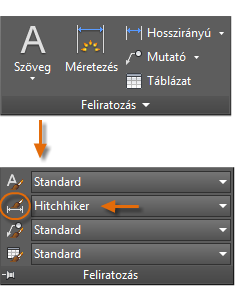 Az aktuális méretstílus neve (ami ebben az esetben Hitchhiker (Stoppos)) a Feliratozás panel legördülő listájában is megjelenik.