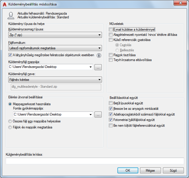 Ha nem módosítja ezt a mezőt, akkor a küldeményfájl az elsőnek megadott rajzfájlt tartalmazó mappában került létrehozásra. Lapkészlet-környezetben a küldeményfájl a lapkészletadat (DST) -fájlt tartalmazó mappában kerül létrehozásra. (Az AutoCAD LT programban nem alkalmazható.)