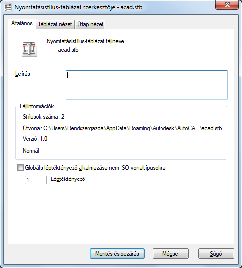 Megjeleníti a nyomtatási stílus táblázat fájlnevét, leírását, verziószámát, helyét (útvonalnév) és a táblázat típusát.