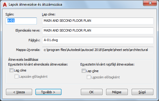 Ha be van jelölve, akkor a rajzfájl neve megváltozik: a lap számával kezdődik, és ezt követi a lap címe.