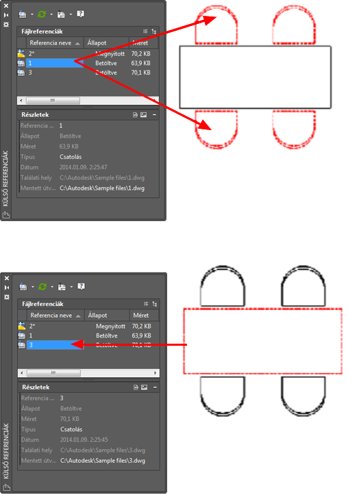 A csatolt xrefek egy adott rajzfájl modellterére mutató hivatkozások. A hivatkozott rajzban bekövetkezett minden változás a rajz megnyitását, illetve az xref ismételt betöltését követően automatikusan megjelenik az aktuális rajzban. A csatolt xrefek nem növelik jelentős mértékben az aktuális rajz méretét.