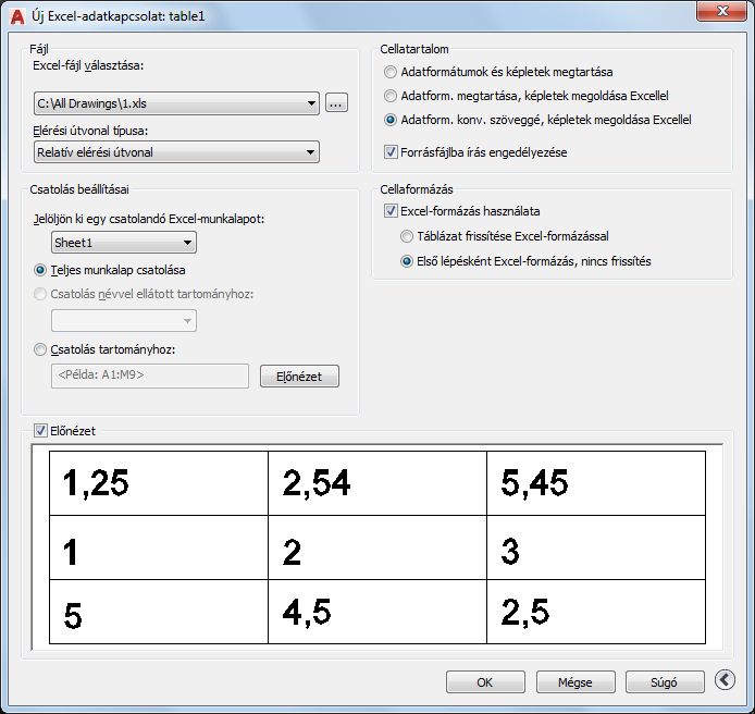 A rajzba importál az eredeti XLS-, XLSX- vagy CSV-fájlban megadott mindenféle formázást, de az ADATKAPCSOLATFRISSÍT parancs hatására a módosított formátumok nem frissülnek.