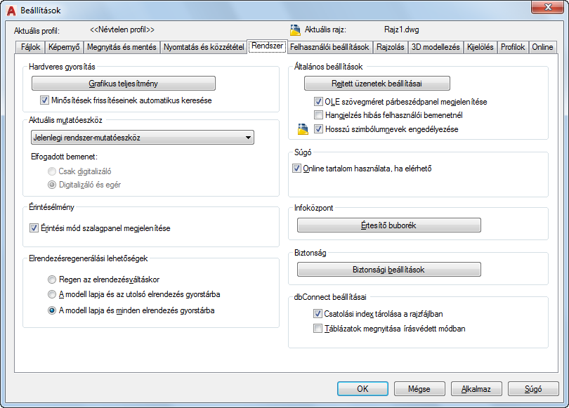 Néhány fent ismertetett beállítás nem érhető el az AutoCAD LT programban.