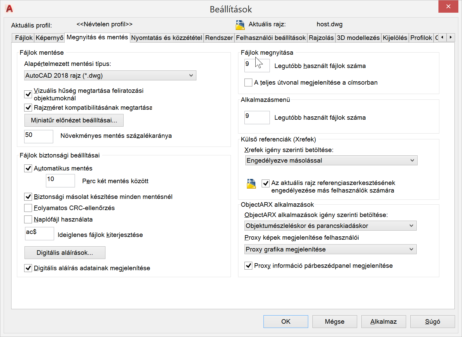 Azokat a beállításokat vezérli, amelyek az AutoCAD futásidejű kiterjesztés alkalmazásokkal és proxy grafikákkal kapcsolatosak.