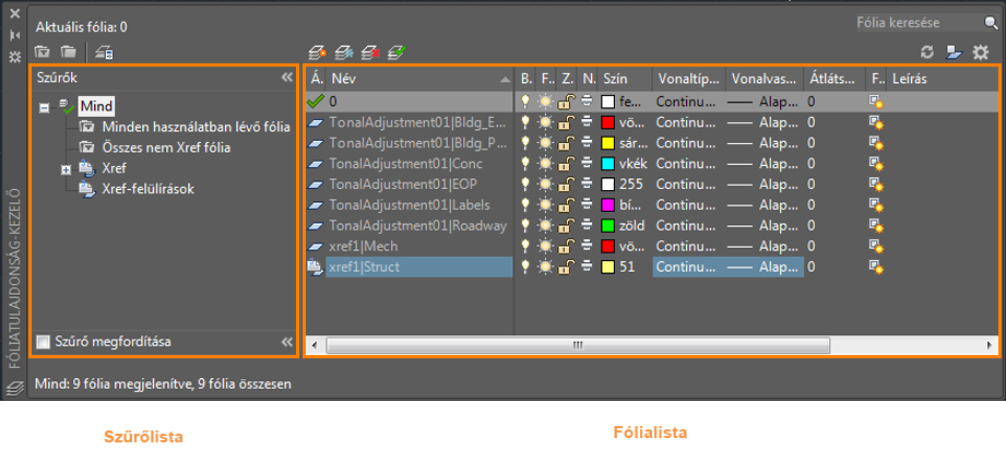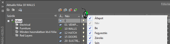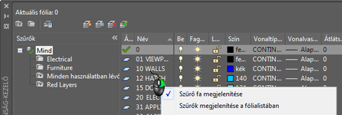 Megjeleníti a rajzban lévő fóliaszűrők listáját. Kattintson a