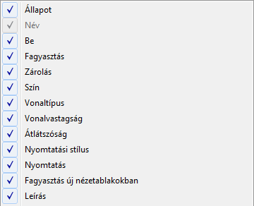 Név szerint rendezve felsorolja az összes oszlopot. Pipa jelzi, hogy az oszlop szerepel a képernyőn. Kattintson egy oszlop nevére az oszlop megjelenítéséhez vagy elrejtéséhez. Az NA fagyasztás, az NA szín, az NA vonaltípusa, NA vonalvastagsága és az NA nyomtatási stílusa csak akkor érhető el, ha egy elrendezés nézetablak az aktív.