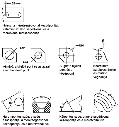 A definíciós pontok mindegyik mérettípus esetében jelölve vannak a következő ábrákon. A méretszöveg felezőpontja egy definíciós pont minden mérettípus esetében.