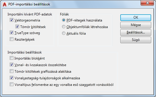 Megadja egy adott PDF-fájlból származó geometria, kitöltések, raszterképek és TrueType szövegobjektumok importálási beállításait.