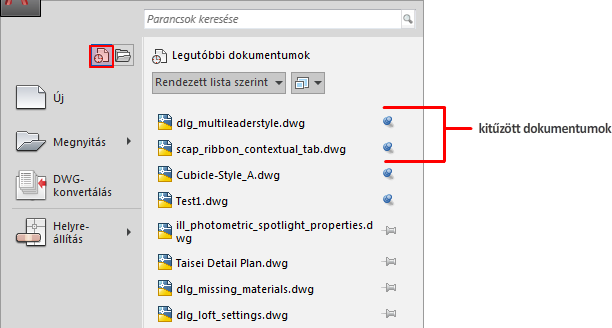A fájlnév jobb oldalán található rajzszög gombra kattintva megakadályozhatja, hogy a fájl lekerüljön a listáról, függetlenül a későbbiekben mentett fájloktól. A fájl egészen addig szerepelni fog a lista végén, amíg ki nem kapcsolja a rajzszöget ábrázoló gombot.