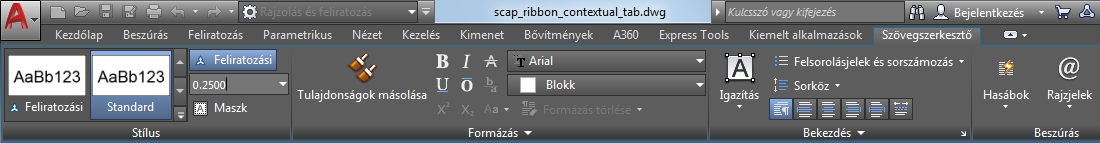 Bizonyos objektumtípusok kijelölésekor vagy egyes parancsok elindításakor egy környezetfüggő szalaglap jelenik meg az eszköztár vagy a párbeszédpanel helyett. A parancs befejezését követően a környezetfüggő lap bezárul.