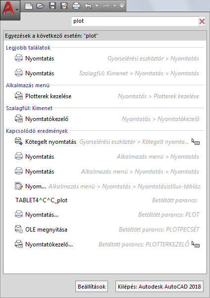 A parancskeresési mező az alkalmazásmenü tetején jelenik meg. A találatok között menüparancsok, alapvető eszköztippek és szöveges parancssori karakterláncok szerepelhetnek. A keresőkifejezést bármilyen nyelven megadhatja. Az eredmények az aktuális munkaterületre vonatkoznak.