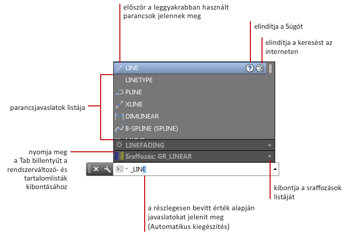 A javasolt parancsok listája megjelenik, amint megadja a parancs első néhány betűjét akár a parancsablakban, akár a dinamikus adatbeviteli mezőben. Alapértelmezés szerint a lista a következő jellemzőkkel rendelkezik: