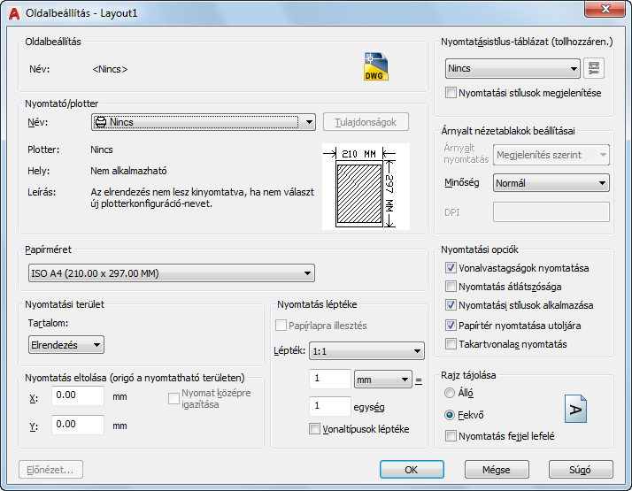 A vonalvastagság, átlátszóság, nyomtatási stílus, árnyalt nyomatok és az objektumok nyomtatási sorrendjének beállításait határozza meg.