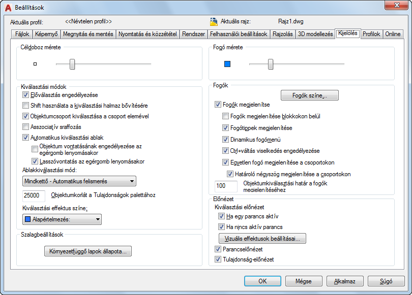 A kiemelés előnézetét csak akkor jeleníti meg, ha nincs aktív parancs. (SELECTIONPREVIEW rendszerváltozó)