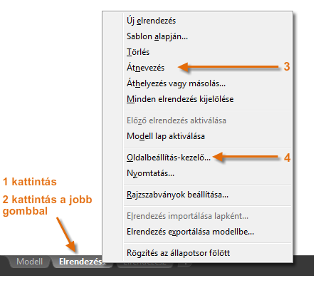 Egy elrendezés lap (1) elérésekor először kattintson a jobb gombbal a fülre (2), nevezze át (3) egy, az 1. elrendezés névnél jellemzőbb névre. A D méretű elrendezésekhez az ARCH D vagy ANSI D jó választás lehet.