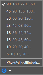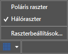 | Keres | Raszter mód | Bekapcsolja a háló típusú rasztert. Amikor a hálóraszterek vannak be kapcsolva, a mutató mozgatása során a mutató a megadott hálóintervallumokra illeszkedik. Amikor a poláris raszterek vannak be kapcsolva, a mutató a megadott távolságokra illeszkedik a megadott poláris illesztési útvonalak mentén. |