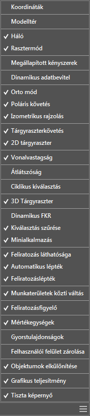 Az állapotsor gyors hozzáférést biztosít az olyan eszközökhöz, amelyek hatással vannak a rajzolási környezetre.