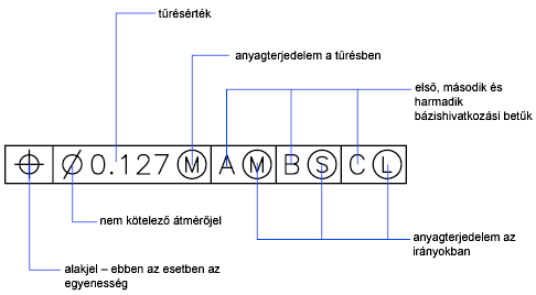Az alaktűréskeretek egy vagy több sorból állnak. Az első keret egy alakjelet tartalmaz, amely azt az alakot jelöli, amelyre a tűrést alkalmazza. Ez lehet például helyzet, profil, alak, irány vagy kifutás. A formatűrések az egyenesség, sík felület, körkörösség és hengeresség ellenőrzését teszik lehetővé, valamint a vonalak és felületek profiljait határozzák meg. Az ábrán szereplő tulajdonság a pozíció.