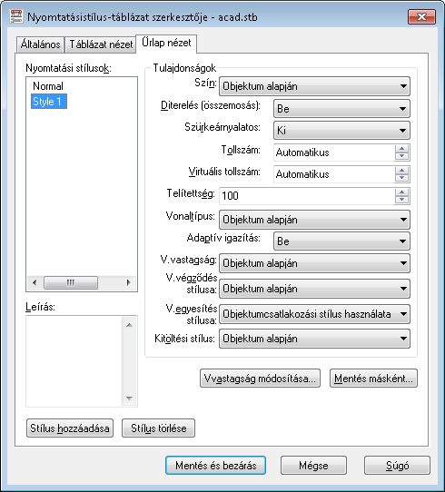 Az elnevezett nyomtatási stílus táblázatokban lévő nyomtatási stílusok nevét jeleníti meg. Az elnevezett nyomtatási stílus táblázatokban levő nyomtatási stílusok módosíthatók. A színfüggő nyomtatási stílus táblázatokban lévő nyomtatási stílus nevek objektumszínekhez kötődnek, és nem módosíthatók. A program legfeljebb 255 karakter hosszú stílus neveket képes kezelni.