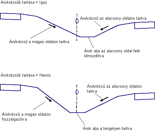A túlemelés vagy a kanyarodósáv következtében az árok rézsűk teteje különböző szintmagasságon lehet a bal és a jobb oldalon, aszimmetrikus árkot eredményezve. Kétféleképpen lehet kezelni ezt a helyzetet. Ha az Árok rézsűk tartása alatt az Igaz érték szerepel, akkor a megadott árok rézsű állandó marad mindkét oldalon, és az árok alja elmozdul a tengelyvonaltól az alsó oldal felé. Ha Hamisra van állítva, akkor az árok alja középső tengelyvonalhoz lesz középre igazítva, a megadott lejtés megmarad az alsó oldalon, és az esés hozzá igazodik a felső oldal eséséhez.