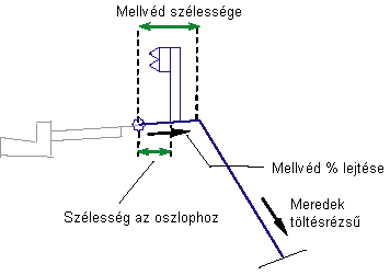 A mellvéd szerkezet felhasználható a meredek töltésrézsű feltételének megfelelő szelvények töltéséhez. Ha megfelel ennek a feltételnek, a Mellvéd szélessége nem nulla, és a Mellvéd felvétele érvényben van, akkor a mellvéd szerkezet megrajzolásra kerül a szelvénynél. A mellvéd szerkezet méretei rögzítettek, ahogy ez az alábbi ábrán is látható.