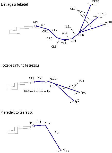 Számos megoldást kínál a bevágási és töltési feltételekhez, az alábbiakban leírtaknak megfelelően. A megadott beviteli paramétereknek megfelelően először megpróbál létrehozni egy bevágási metszetet. Ha ez nem lehetséges, akkor létrehoz egy töltési metszetet. A végső körömvonal kapcsolódás elhagyható azokban az esetekben, ahol a nyomtervmodellt nem kell befejezni. Ezzel például megtehető az, hogy az egymás melletti rézsű felületek a még nem befejezett út sarokpontjaihoz kapcsolódjanak.