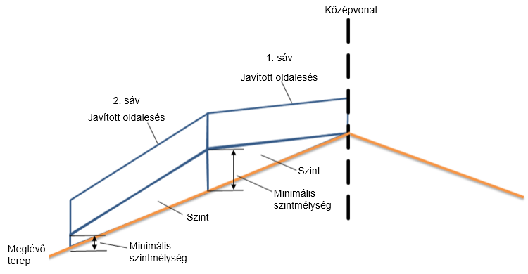 | Meglévő sáv külső élének eltolási célja | A külső mintapont eltolását meghatározó objektum neve, amely segítségével a program kiszámolja a meglévő felület lejtését. A következő objektumtípusokat lehet megadni az eltolás céljaként: nyomvonalak, vonalláncok, vezérlővonalak és földmérési alakzatok. | Nem |