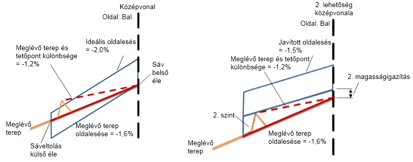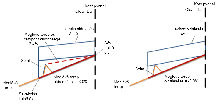 | Javított oldalesés | Ez az út módosított oldalesése, amely úgy lett optimalizálva, hogy a lehető legjobban illeszkedjen a megadott felújítási alkotóelem paraméterekhez. | Numerikus | –2,00% |