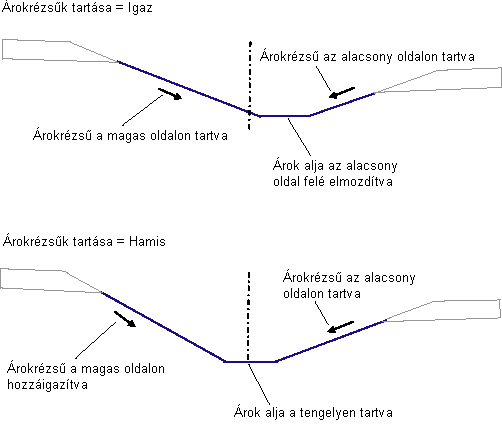 Az árok rézsűk teteje különböző szintmagasságon lehet a bal és a jobb oldalon, aszimmetrikus árkot eredményezve. Kétféleképpen lehet kezelni ezt a helyzetet. Ha az Árok rézsűk tartása alatt az Igaz érték szerepel, akkor az Esés 1 értéke és az Esés 2 értéke megmarad mindkét oldalon, és az árok alja elmozdul a tengelyvonaltól az alsó oldal felé. Ha Hamisra van állítva, akkor az árok alja az esések teteje közötti középponti eltoláshoz lesz középre igazítva, a megadott lejtés megmarad az alsó oldalon, és az esés hozzá igazodik a felső oldal eséséhez.