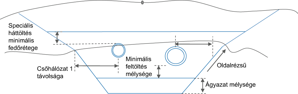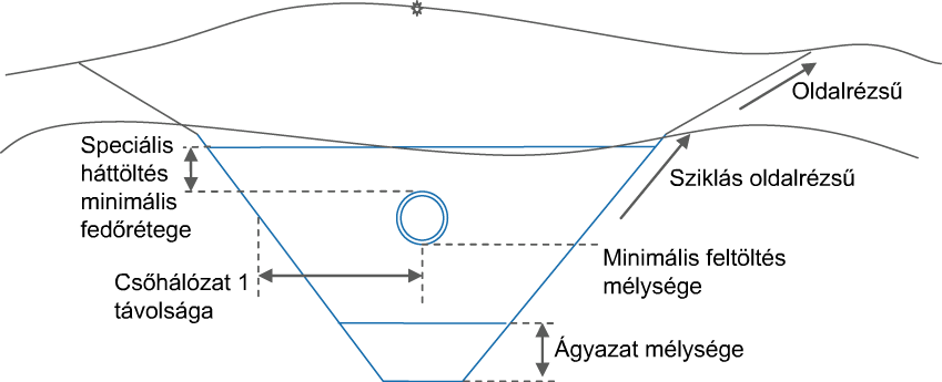 Két csőhálózat kiválasztásakor alapértelmezés szerint a Csőhálózat 1 van a kiindulási vonal bal oldalán, a Csőhálózat 2 pedig a nyomvonal jobb oldalán. A Speciális háttöltés minimális mélységének anyagmélységét a kettő közül a magasabb felső külső átmérő és a Speciális háttöltés minimális fedőrétegének értéke határozza meg. Az árok aljának mélységét a kettő közül az alacsonyabb alsó külső átmérő, a Speciális háttöltés minimális mélysége és az ágyazat mélysége határozza meg.