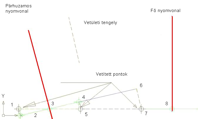 A következő ábra azt mutatja be, hogyan működik a KapcsolásMegjelöltPonthoz2 alkotóelem, illetve hogyan jelenik meg a nyomterv eltolt bázisvonalú keresztmetszetében.