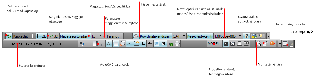 Az alkalmazásablak alsó területe állapotinformációkat jelenít meg, és néhány vezérlőt tartalmaz a nézet megváltoztatásához.