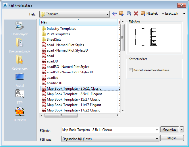 Rajz parancsra. Az AutoCAD Map 3D automatikusan a Template mappára vált át.
