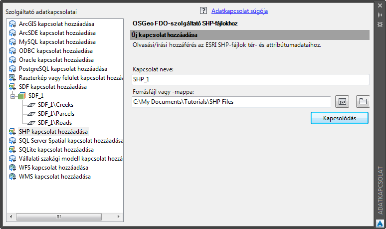 Hozzon létre egy új, üres mappát az SHP-fájlok számára. Adatok SHP formátumba konvertálásához és másolásához csatlakoznia kell ehhez a mappához. Az Adatkapcsolat párbeszédpanelről létesíthet kapcsolatokat az adattárakhoz, akkor is, ha nem kell semmit sem leképeznie az adattárból.