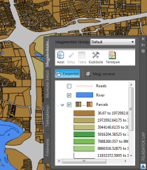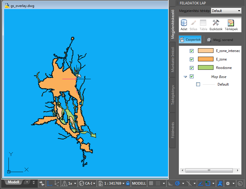 A térképen két fólia van egymásra vetítve (az ártér és a vállalati zóna). Az átfedés segítségével megállapítható, hol találhatók közös elemek. Ez a terület külön fóliává válik, amely stilizálható, elmenthető egy fájlba és külön adattárként használható.