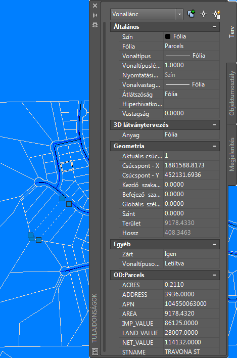 Tulajdonságok lehetőségre. A rózsaszín vonalláncok olyan telkeket jelölnek, amelyek objektumadatai címhez, területhez, értékhez stb. kapcsolódnak.