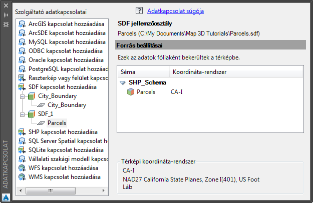Az Adatkapcsolat ablak az összes csatolt, nem DWG adatforráshoz kapcsolódó információt megjeleníti, akkor is, ha azokat nem az Adatkapcsolat használatával csatolta. A vontatással a térképhez adott SDF-fájl például az Adatkapcsolat ablakban jelenik meg.