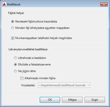 - A Leadás párbeszédpanelen kattintson a Beállítások lehetőségre, és válassza ki az Elküldés a feladatszerverre lehetőséget a Látványtervmelléklet beállításai területen.