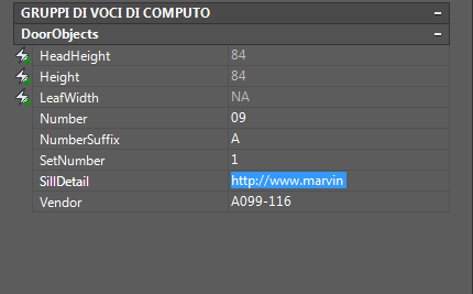 Nota: I campi possono essere associati mediante collegamenti ipertestuali. Ad esempio, se si inserisce un campo tramite la creazione di un collegamento ipertestuale ad un disegno in una proprietà manuale e si crea una tabella di computo che contiene tale proprietà, è possibile passare dalla cella della tabella contenente la proprietà del campo al disegno a cui è collegata.