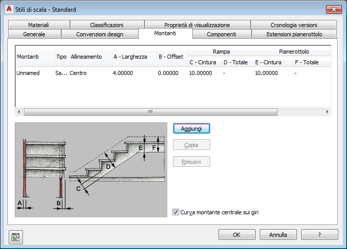Per impostare giunture ad angolo per montanti centrali in corrispondenza di giri o pianerottoli, attenersi alla procedura indicata di seguito. È possibile impostare tali tipi di giunture per scale a più pianerottoli, a forma di U e personalizzate, ma non per scale diritte o a chiocciola.