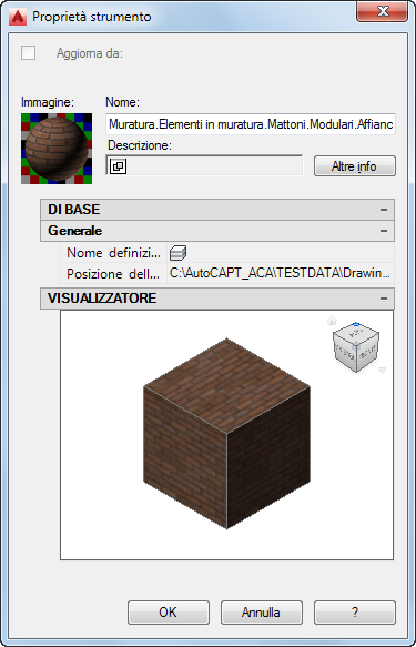 Se si trascina un materiale di rendering dalla Libreria ad un disegno di AutoCAD Architecture, da tale materiale viene creata una definizione di materiale di AutoCAD Architecture. Con questo metodo non è possibile creare direttamente uno strumento Materiale di AutoCAD Architecture. La nuova definizione di materiale viene visualizzata in Gestione stili, dove è possibile creare uno strumento Materiale basato su tale definizione.