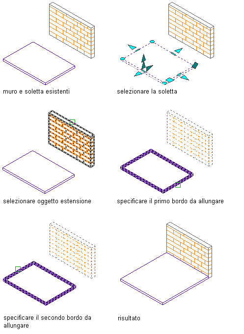 Poiché nel corso di un'operazione di estensione potrebbe essere necessario spostare più bordi, viene richiesto di selezionare i bordi adiacenti da allungare, invece dei bordi specifici da spostare. I bordi selezionati mantengono il vettore (angolo) corrente e vengono stirati fino ad intersecare il piano dell'oggetto di destinazione.