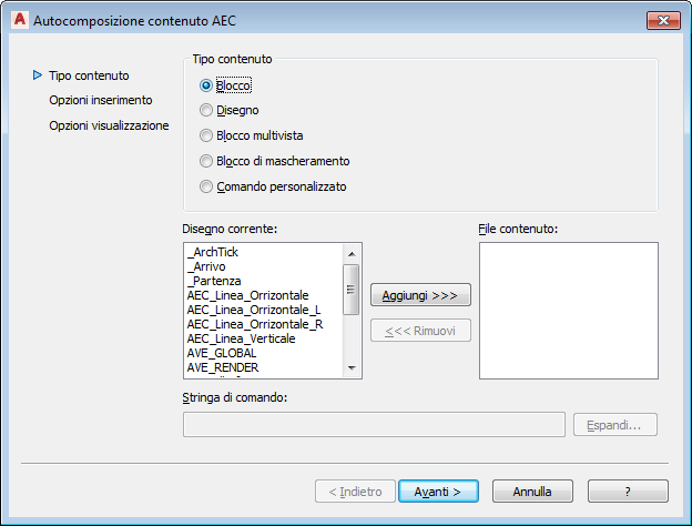 L'Autocomposizione contenuto AEC consente di creare contenuto personalizzato. È possibile creare blocchi, disegni e comandi a partire dai dati esistenti nel disegno corrente.