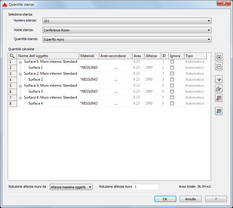 Vengono elencate tutte le superfici muro che appartengono alla stanza selezionata. Per ogni oggetto e faccia viene visualizzata l'altezza.