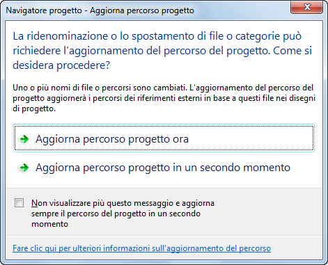 Viene visualizzata la finestra di dialogo Navigatore progetto - Aggiorna percorso progetto.