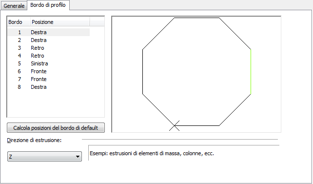 Quando si crea un profilo, tutti i bordi vengono contrassegnati per l'estrusione nella direzione Z. Tali posizioni dei bordi vengono calcolate in base al quadrante in cui si trova il punto medio del bordo. Nella definizione del profilo, è possibile modificare la direzione dei bordi e la direzione di estrusione.