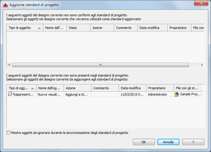 In questo caso, l'impostazione di visualizzazione non standardizzata non verrà più elencata nei successivi aggiornamenti, a meno che non si selezioni l'opzione Mostra oggetti da ignorare durante la sincronizzazione degli standard di progetto o non si rimuova il flag Ignora dall'impostazione di visualizzazione in Gestione visualizzazioni.